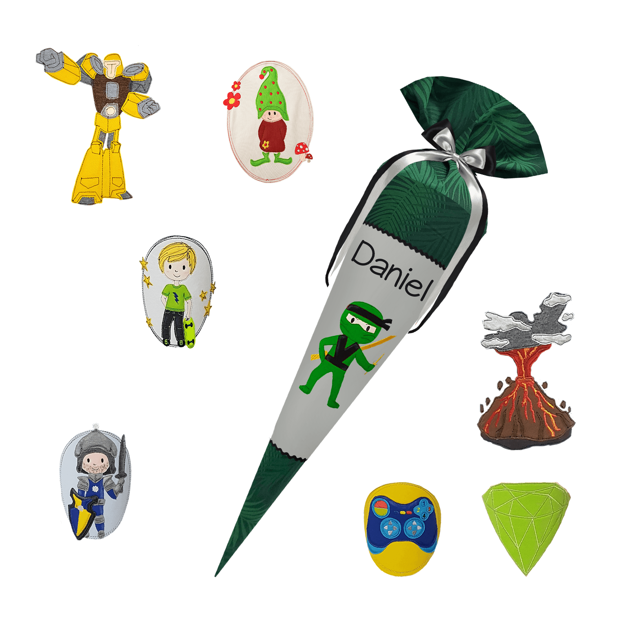 Du kannst deine Wunsch-Schultüte ganz einfach nach deinen Vorstellungen gestalten. Wähle aus verschiedenen Stofffarben, Motiven und Schriftarten und erstelle so eine einzigartige Zuckertüte für dein Kind.